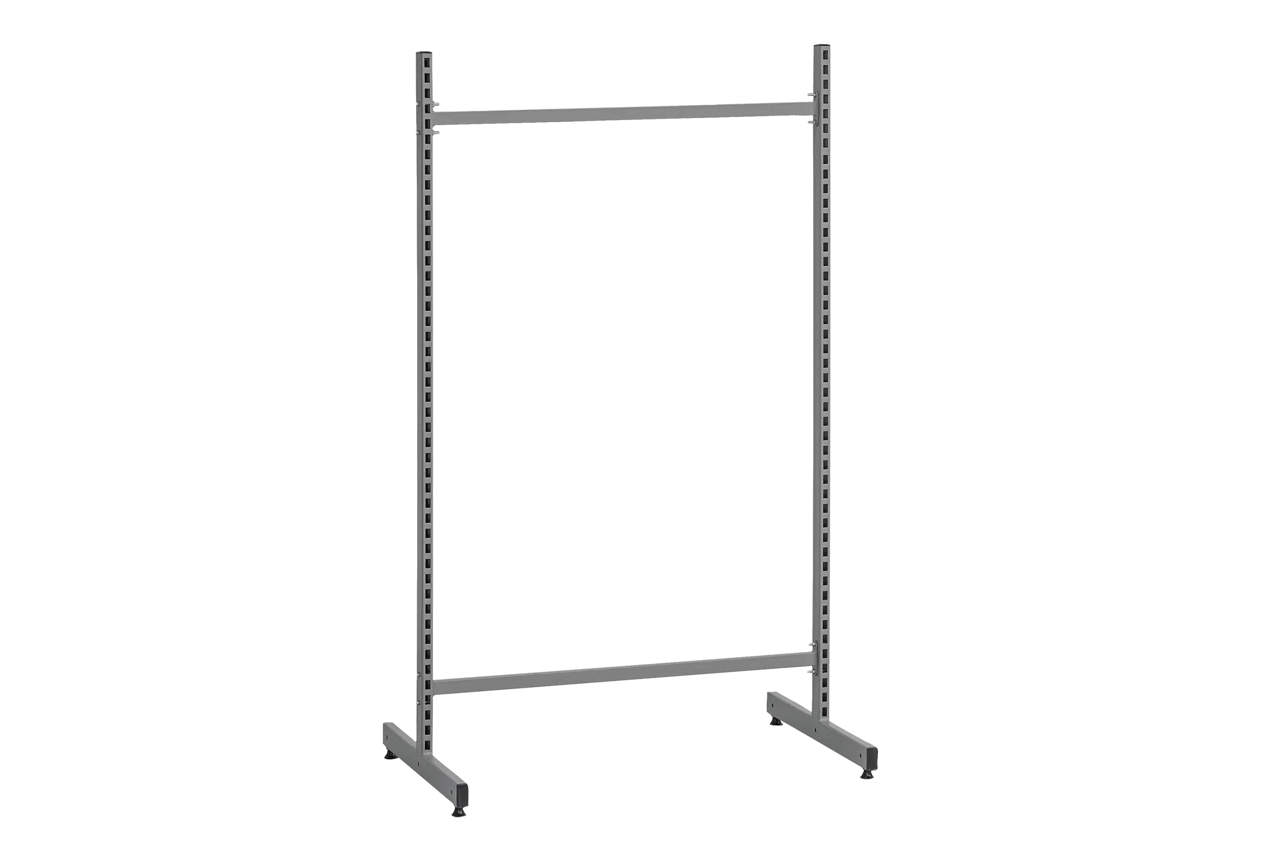 Freestanding T-rack for placement on floors. The T-rack has double foot and is preferably placed freely in the room for easy access to the material from both sides. Can be built and customized with accessories according to your needs, choose between everything from suspension rails and perforated panels to different types of shelves and plastic bins. Adapted for our accessory range c/c 900 mm. Manufactured in perforated tube profile (50×25 mm) and powder coated in grey NCS 6502B. Load capacity 150 kg distributed weight.