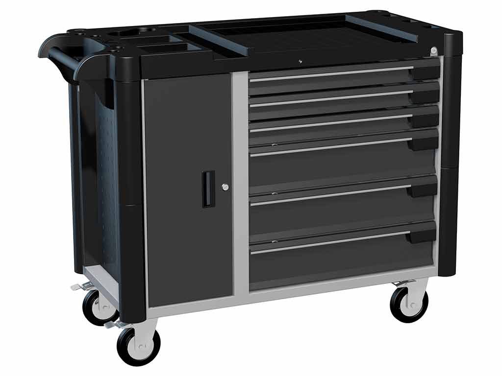 Täielikult keevitatud ja galvaniseeritud ratastel laud, millel on roostevaba terasega kaetud vineerist tasapinnad.