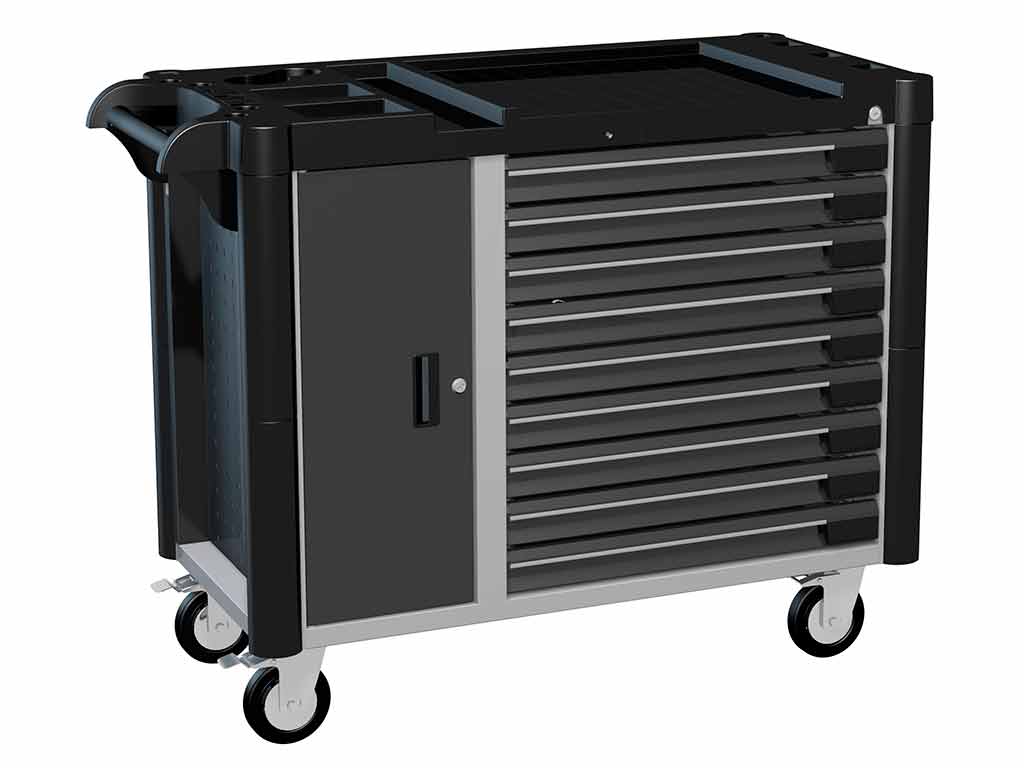 Täielikult keevitatud ja galvaniseeritud ratastel laud, millel on roostevaba terasega kaetud vineerist tasapinnad.